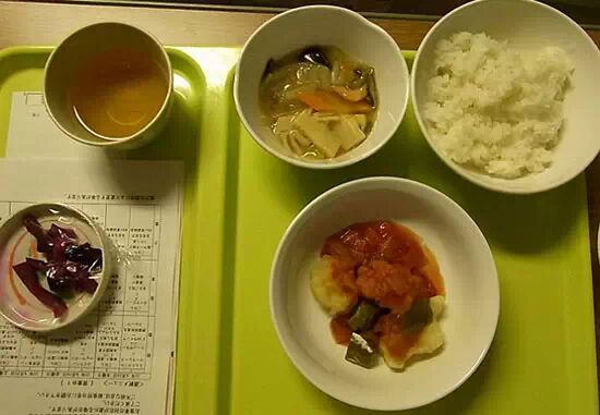 日本东京医院餐, 包括酸黄瓜、汤、米饭和鸡肉等