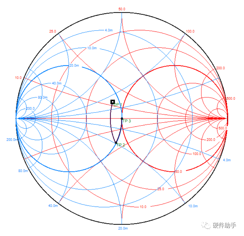通过采用在史密斯圆图上并联电容,串联电容,并联电感,串联电感的方式,把原始阻抗点匹配到50欧姆,也就是红色大圆和蓝色大圆的交界点。
