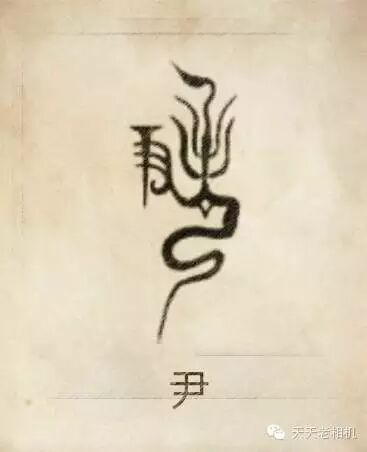 尹姓图腾,尹是以官职为图腾命名的族称。它由两部分组成。右边是一个官员,左边是一个辛刀,代表刑具,合起来就表示手持刑具的官员握有生杀大权,这种管理者称为尹。始祖少昊之子工正殷(尹)封于尹得姓
