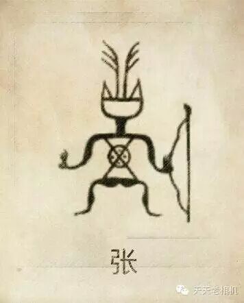 张姓图腾,张姓是炎帝共工氏的文明创造的图腾标志。它的本义并不是长长弓箭。“弓”实际上代表盖天图,一般作天穹的“穹”。“钺”是模仿其形状而来。共工氏是张氏的始祖,远古三苗之一柯乌耶劳的嫡传。张像一个人手持盖天图。他手中所握的“弓”表示日升汤谷经中高天落入禺谷的形象符号,“弦”为地平线,代表日夜的分界线。日夜两个盖天图和起来就是浑天图,代表一整天