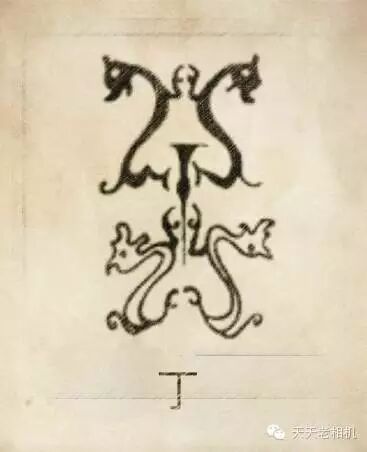 丁姓图腾,丁是炎帝第五世祝融氏一支的族称。丁为金属楔子。丁的图腾由金属楔子和祝融氏的图腾火龙组成。祝融氏为火正,世代掌管“铸融”,即金属冶炼,冶炼出的像丁字形的金属楔子有两种用途:一是用来做契刻的刀,也称为治,同时又是刑具,用来行刑的。作刑具时又写作“辛”,同时还代表权杖,所以在图腾的上方加“辛”字符号的都为帝。为崇龙之族。