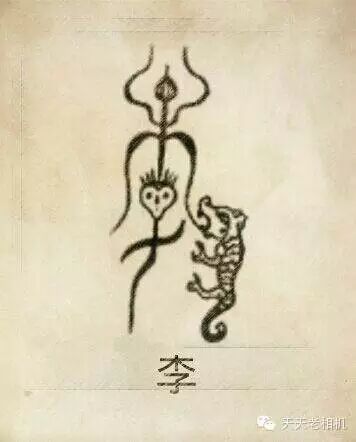 李姓图腾,李姓是九黎民族之一的氏族的族称。皋陶是李姓的始祖。黎就是虎,又可以写作(豸+里)、狸、理,通假谐音作李。李姓图腾由虎、木、子三部分组成。虎代表皋陶的祖先少昊,木代表皋陶玄鸟族的图腾,子是鸟卵,象征后代子孙。李姓图腾象征白虎少昊的后代。史载皋陶为大理;又传皋陶裔理征因谏商纣王被追杀、食李果充饥得救;因得“李”姓。