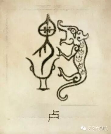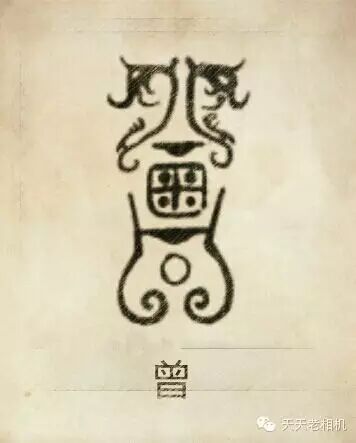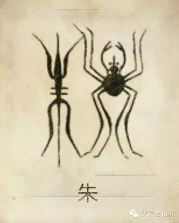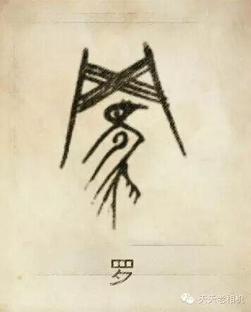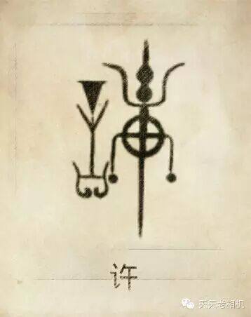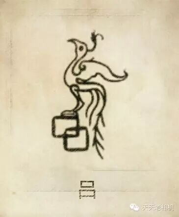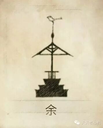 徐姓图腾,徐是淮夷一支的族称,由“余”和“太阳鸟”组成。(左边是玄鸟向日,暗合徐氏始祖由鸟所生的传说。)“余”本是“俞”,类似箭矢的尖锋,它装在天竿华表建木的顶端,指向中天,用它来代表“天齐”(天的肚脐),也就是“中央”。这个形状在7400—7000年前的湖南黔阳高庙遗址的陶器刻符和浙江余姚河姆渡遗址的陶器和骨雕上的刻符上,都已出现为天竿俞,