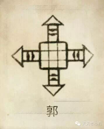 郭姓图腾,一是“郭”象四方的城楼的整体形状,以此为图腾标志。居住在东城的称东郭,居住在西城的称西郭,居住在南城的称南郭,居住在北城的称北郭。二是“郭”,今以为城郭字。按“郭”,篆文左边作两“亭”(省文)上下相对,左边为“邑”(阝)。甲古文原作上下左右四“亭”(省文)相对,中间为囗,象内城。故郭本义似为围墙上之望亭,或会“自内城向外扩展,即外城”之意。“虢”与“郭”音相似。