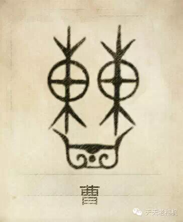 曹姓图腾,曹姓是炎帝第五世祝融八姓之一的族称。曹上部取象在灵台(瑶台或坛台)设立的春秋东西卯酉二建木,是两个“东”字左右并列,表示卯和酉在一条水平线上,中间穿过建木。下部就是灵台,又是日出汤谷的象形。曹姓始祖为陆终五子安。曹族迁到中国台湾后称为曹人。周文王第13子振铎封曹得姓