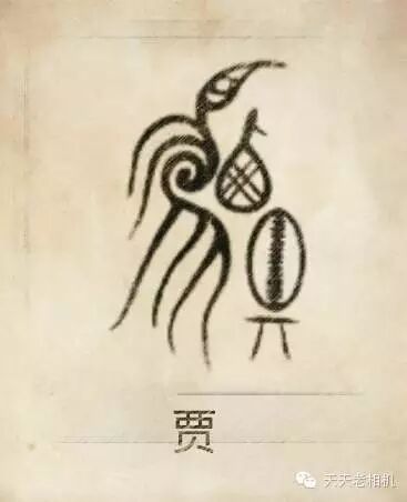 贾姓图腾,贾姓图腾.贾姓是源于炎帝氏日中为市、以物易物的集市。所以贾由“西”、“鸟”、“贝”、“基”组成。鸟代表日,“西”、“鸟”合文代表炎帝,发祥于西华,陈于“基”上,以待交易。可作商人解。倾向作解凤凰作歌乐,为崇凤之族。起源主要有三:①出自姬姓,贾伯之后。②出自狐偃之后,以邑为氏。③出自少数民族。始祖:贾公明。