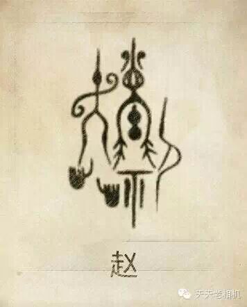 赵姓图腾,赵是东夷民族少昊族团的一支伯赵氏的族称。由高大的巨人奔走的人形和在供案上供奉“肖”的图形组成。肖是玄鸟燕子(偃、赢)的象形,“赵”是“肖”的繁体,“肖”是“赵”的简体,同时又可作“御”。因为秦(赢)姓的祖先受封于伯赵氏的旧地,他曾为周幽王驾车有功,赐地在赵,所以“赵”、“肖”“御”又为一字。造父祖为皋陶,皋陶以玄鸟“伯赵”为图腾,故赵父从“肖”图腾。