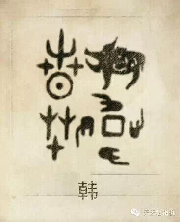 韩姓图腾,韩姓是韩荒氏族的族称,韩荒又作韩流。韩荒氏的远祖封豨氏最早驯化野猪,所以以此为图腾。韩荒是封豨氏和句芒氏合婚的新族,是五帝之一颛顼的祖先。韩荒族继承句芒氏发明的勾股定理观测太阳的运行。代表太阳的周天运行,“+”字代表太阳运行的阶梯,共有六个“十”字,因为当时的历法是六合历,野猪的肚子上有个太阳纹,证明他是太阳的氏族,下面是一个城郭的象形,而且周围有人巡逻,说明韩荒时代已经有了城和军队。辽宁和内蒙古红山文化是韩荒氏族的文化,其中还有黄帝族文化,北方民族改“汗”为韩