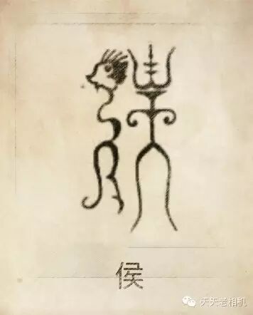 侯姓图腾,侯是以猴图腾得姓。右为座前礼器,左为峨冠端坐之士。诸侯王族。黄帝打败榆罔、夸父后,猴图腾的魁隗氏从帝位降为侯伯,所以由猴而侯。侯姓,是一个古老而又多源的姓氏。