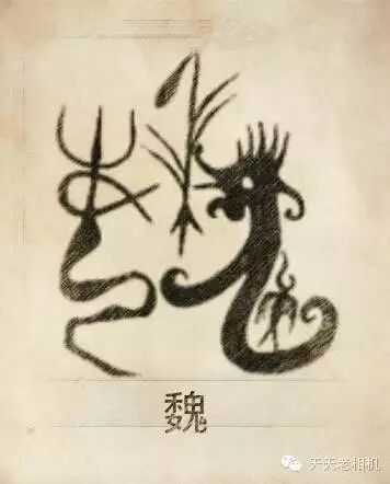 魏姓图腾,魏姓是以委蛇肥遗龙虺为图腾的炎帝支鬼姓的苗裔,其始祖是共工氏与蚩尤氏,两族为世代郎舅亲,共同以肥遗龙(一头双身龙)为图腾。魏图腾由三部分组成,左边的女性象征炎帝魁隗氏的母亲任姒,右边的一头双身龙象征鬼,中间的禾代表他们的农业发明。周文王裔孙毕万受封魏邑,子孙以国为姓。始祖:毕万。