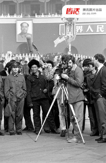 20世纪80年代后期,美国新闻记者在天安门广场上采访中国民众,战士(左一)双手插兜的放松状态表明了他不是一位执勤者,而是一位来到天安门的游客,这个时候政府还会倡议普通群众“不要围观外宾”,但使用摄像机的外宾,还是会引起人群的兴趣。