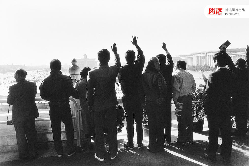 1988年1月1日,北京国际旅游年的第一天,天安门城楼正式开放。为保证天安门城楼准时开放,天安门管理处的同志奋战了数日,他们将大厅原来铺设的纯毛地毯换下,铺上红色的化纤地毯。图为1988年,登上天安门城楼的游客们模仿毛泽东向民众致敬的姿势,“人民万岁”的“弗兰”口音普通话不绝于耳。