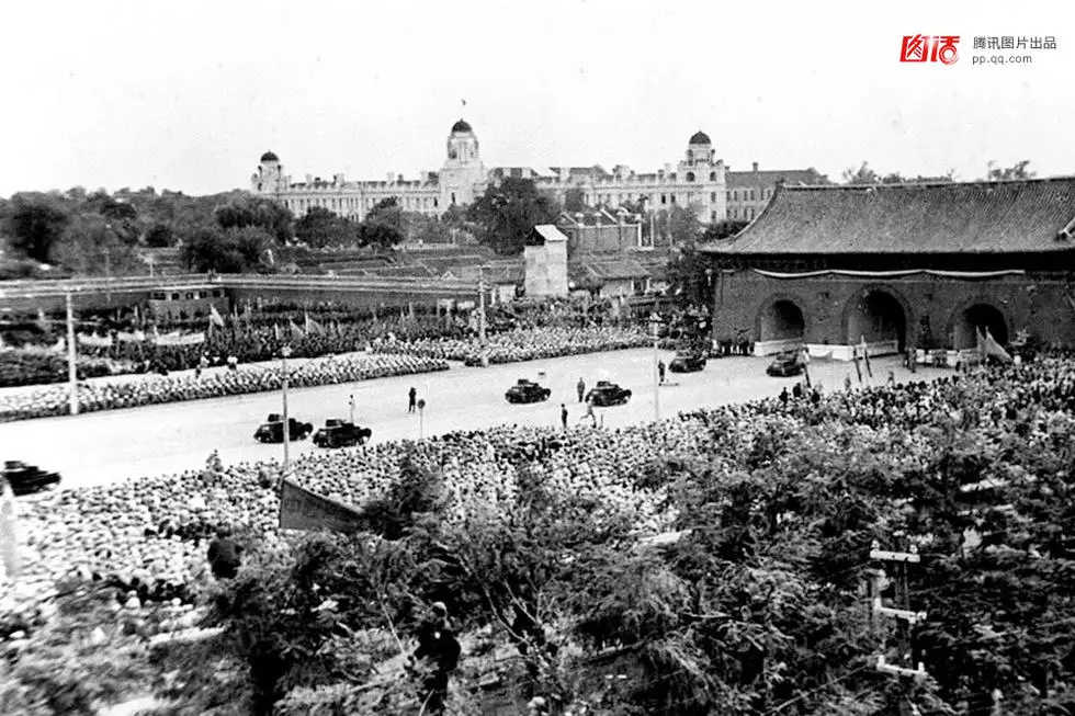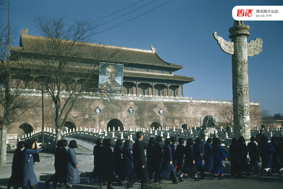 在1950年代,天安门广场进行了一系列的扩建,狭窄的广场从此成为了真正意义上的天安门大方块(Tiananmen square)。而数次的改造扩建,无一不是以政治为核心。1950年,因广场旗杆与天安门之间的距离不够将来要过游行队伍的宽度,天安门前的华表和石狮子被移动了6米,这曾引起建筑学家梁思成的不满。画面远处广场上的中华门,曾是明清民国三朝的国门象征,分别叫大明门、大清门、中华门。1959为扩建天安门广场,中华门被拆除。如今是毛主席纪念堂一带。新华社记者 齐观山 摄