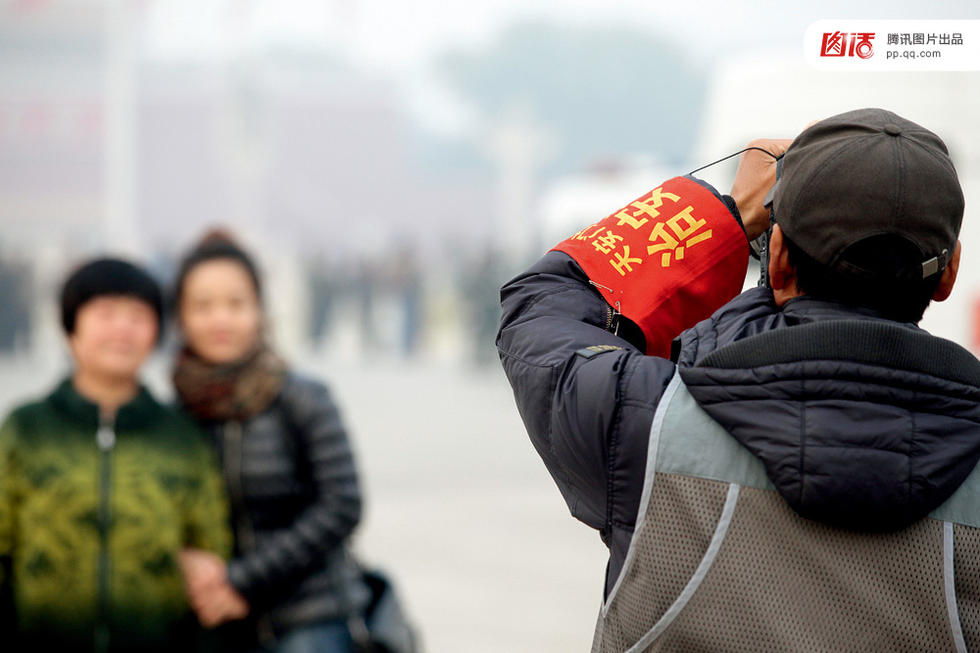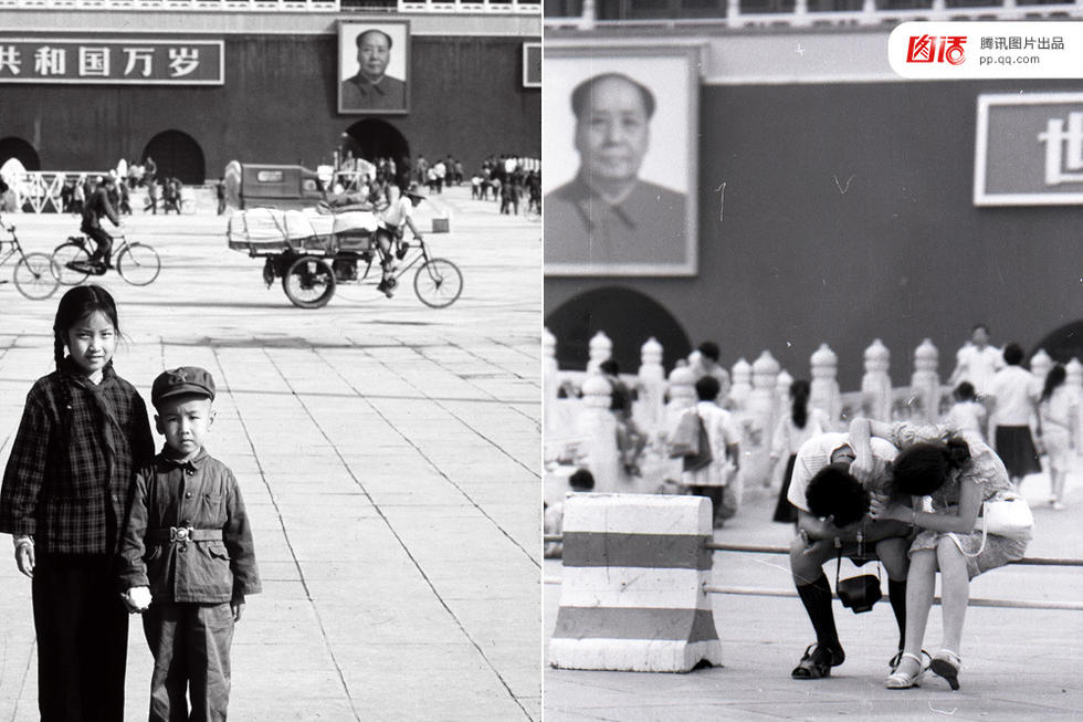 新中国对天安门广场的历次扩建与修改,完成了对广场政治含义的强化。对许多中国人来说这是一个“最有意义”的地方。但天安门广场44万平方米的空间没有给游客提供遮阴避暑的地方。图为在天安门广场上郑重合影的小孩,右图为坐在广场栏杆上休息的游客。