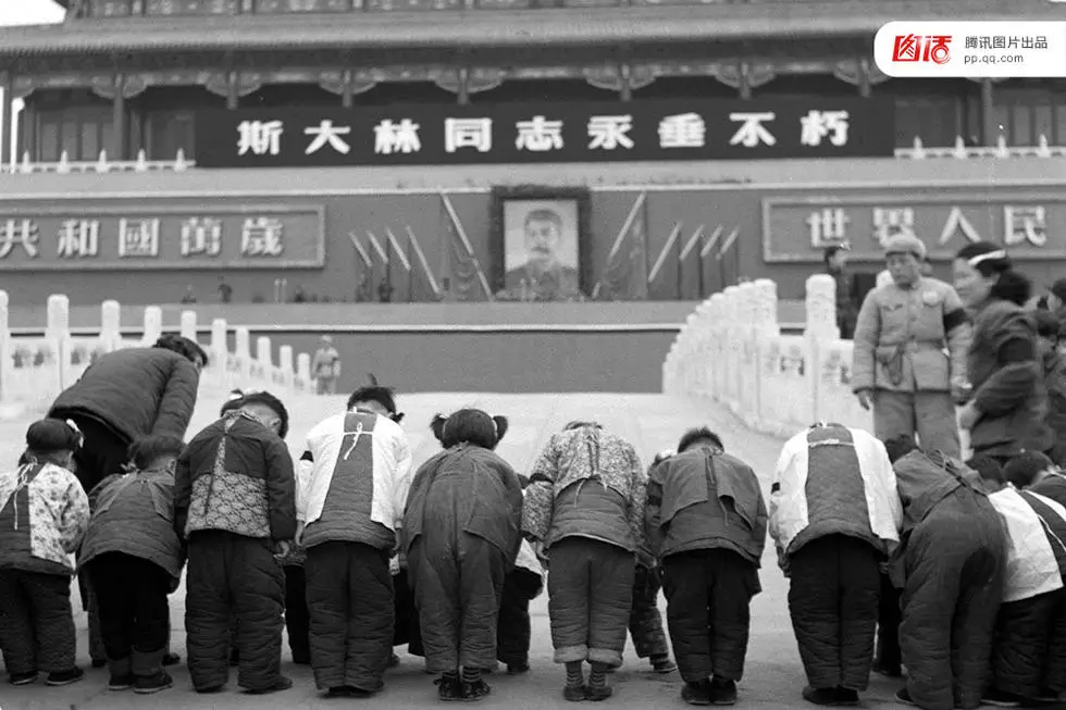 1953年3月5日,苏联最高领导人斯大林逝世,50年代中国正掀起全民学习“苏联老大哥”浪潮 。3月9日下午5时,北京各界人民在天安门前举行追悼斯大林同志大会。图为北京市的儿童在天安门前向斯大林遗像行礼志哀。姜伟 摄