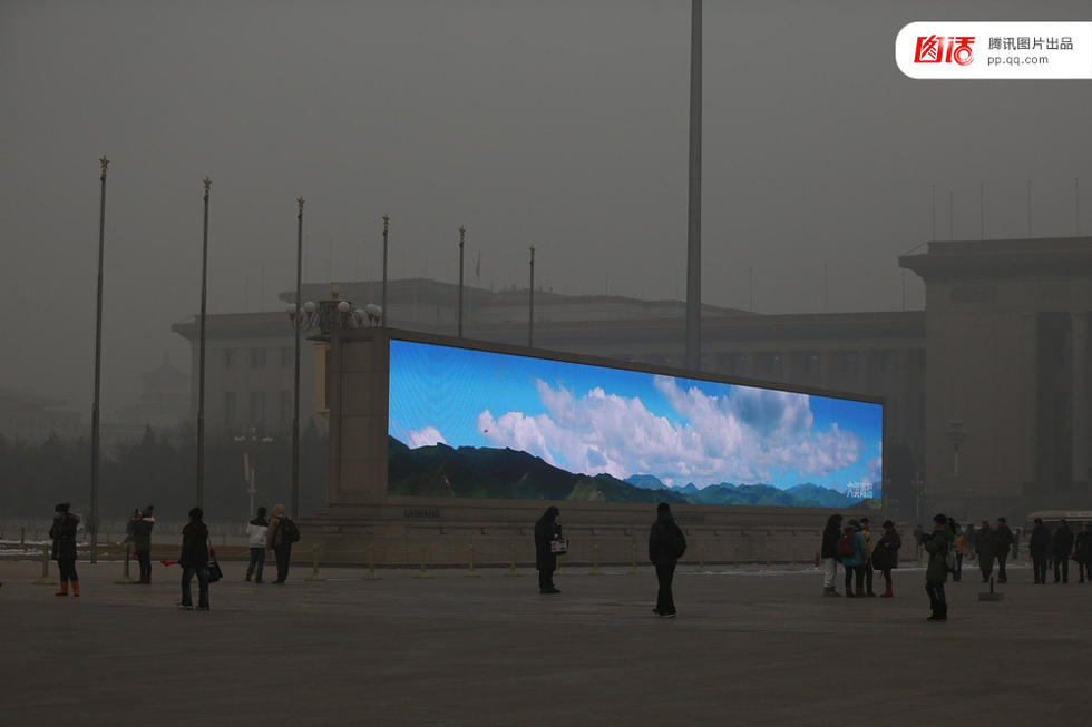 天安门广场在近30年间没有大变动,而新的改变体现在细微末节处,高科技从各个角落渗透进广场。2009年为迎接国庆六十周年庆典,两块巨幕被安置在天安门广场,屏幕上滚动播出城市的风光片和公益广告。它们不接商业广告,尽管每年维护费用达1600万元。曾有江湖骗子向各地政府和企业许诺能接大屏幕广告而被逮捕、起诉。图为2013年,游人在雾霾中观看“蓝天白云”的宣传片。李锋/CFP