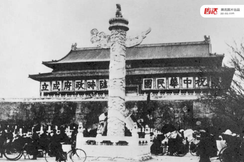 1912年2月12日隆裕太后在天安门城楼上以宣统皇帝(溥仪)名义发布退位诏书。1914年5月,北洋政府的朱启钤启动了改造旧都城计划。拆除天安门前千步廊、修筑沥青路、拆除瓮城等,原本封闭的宫廷广场变成可自由穿行和逗留的开放空间,威严、神秘的皇权被消解。图为1912年,北平天安门城楼高挂“祝中华民国临时政府成立”的大幅标语。FOTOE
