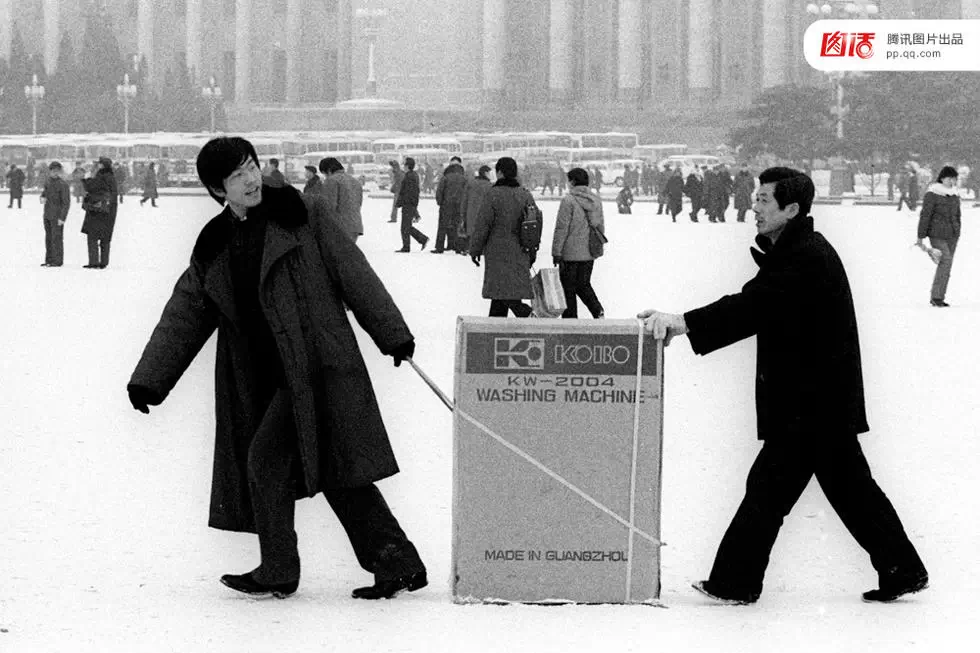 开放带来的社会的变迁也在广场上找到注脚。图为1983年,天安门广场,刚刚购买了洗衣机的市民。 穿过广场应该不是为了炫耀,而是为了抄近路。