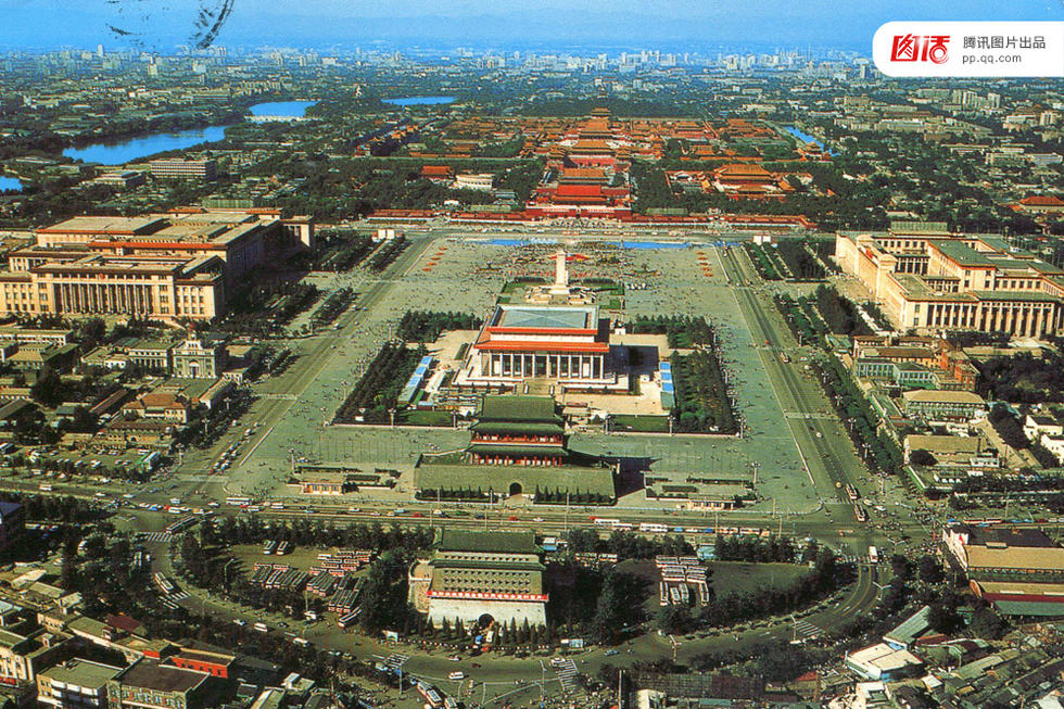 1976年9月9日,毛泽东逝世。天安门广场进行了最后一次大规模改建——修建毛泽东纪念堂。这个曾在天安门城楼上接受众人崇拜的领导人,最后来到广场中央为自己的时代画上了一个句号。图为改建完成后的天安门全景。