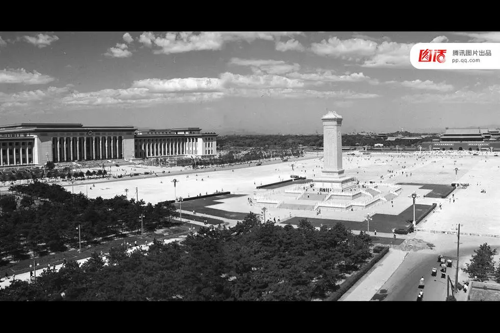 为迎接十周年国庆,1958年天安门广场开始了史上最大规模的一次扩建。拆除了中华门、棋盘街及广场上的红墙,最终达到宽500米,长880米,总面积达44公顷,是俄罗斯红场的9倍。建筑师陶宗震曾建议把宽度压缩以适应周边道路的连贯,被告知:“不能动,这是毛主席定的。”同时,广场上竖起的人民英雄纪念碑和两侧建起的人民大会堂、中国革命和军事博物馆,奠定了广场作为政治中心的基调。图为在国庆10周年前夕的北京天安门广场。新华社记者 杜海振 摄