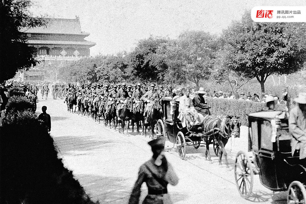 天安门成为现代意义上的广场,源于1914年。而在此之前,天安门前只是一块封闭的T形宫廷广场。天安门前身叫承天门,落成于1417年(明永乐十五年),是明清两朝举办重大庆典和向全国发布政令的重要场所,也代表着皇权的威严。晚清,1900年八国联军入侵北京,天安门广场被当成了入侵者屯兵耀武之地。图为1900年8月14日,八国联军在北京天安门前举行皇宫占领式。新华社发(前门箭楼管理处提供)