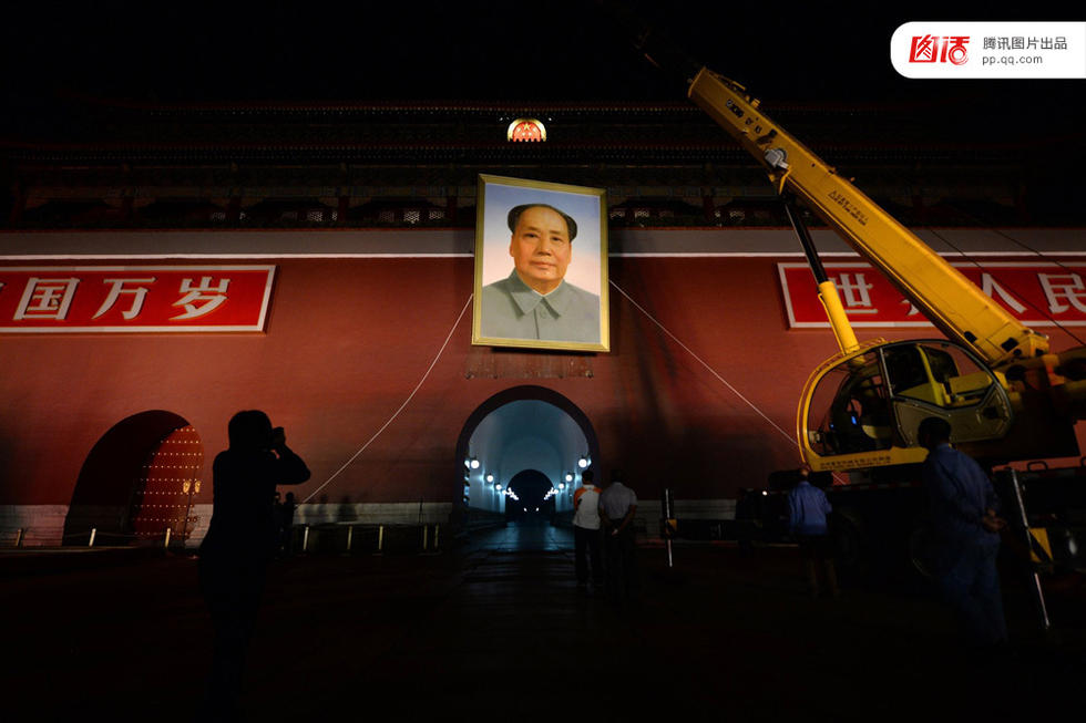天安门广场是个充斥着高浓度公众记忆的地方,44万平方米的地面上,铺满了历史丢下的线头。近几十年间,天安门广场上的变化缓慢而谨慎,而它的政治符号意味从未减弱。2014年9月27日凌晨,天安门城楼,为了迎接国庆,工作人员换上新的毛主席像。