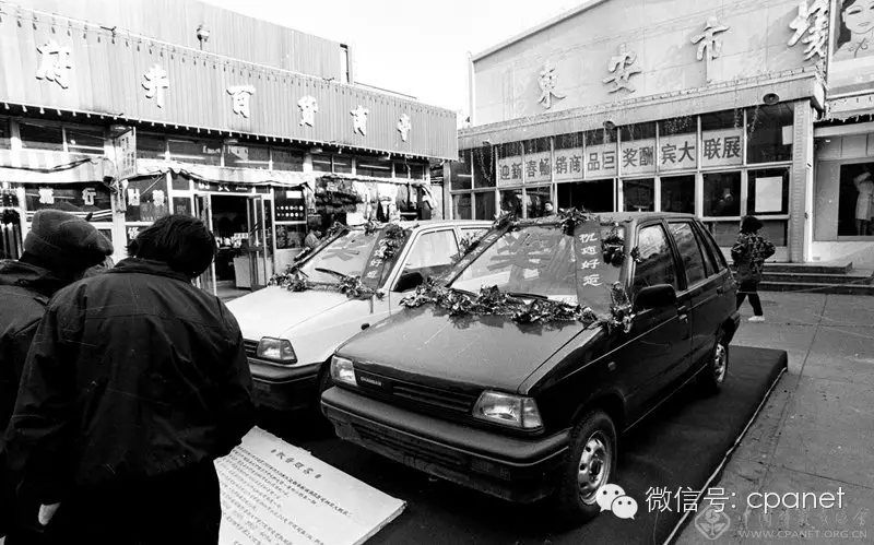 1997年,四川民工武富贞家3岁孩子手气相当好,在地坛庙会当场抽中一辆桑塔纳。上世纪九十年代,街头彩票抽奖活动是人们过年的一大乐事儿。图:胡金喜