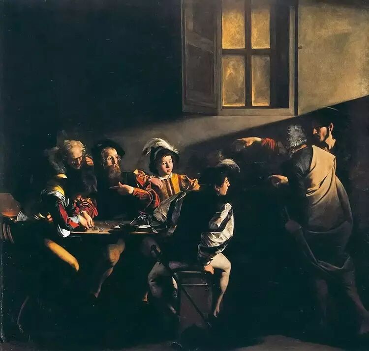 画作《召唤使徒马太》是画家卡拉瓦乔创作于1599至1600年间的一幅油画。使徒马太的形象刻画得非常成功,给人以真诚,厚道的感觉。正如“圣经” 所说他做过农民,手脚粗壮,神情憨厚,是基督需召唤的“能认识自己职业是被唾弃的人” 隔在基督和马太之间的青年兵士,转过身体,警觉地望着这两个不速之客,似乎又在观察来人。戴着羽毛帽子的青年也惊异地看着基督,而马太右边两人则低头 点钱,不作理会。这些处理构成了强烈的戏剧性冲突,加强了人物关系的节奏感,使画面更耐人寻味、让人捉摸。这些就是卡拉瓦乔艺术的成功之处。