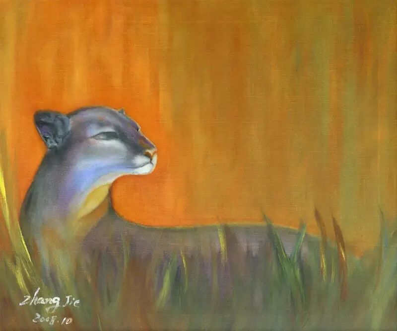 虽然张洁反对将她的画具体化,但我确实在这幅画中看到了时间与空间的交糅,冷寂与热情的冲撞。她最爱画的是豹子,一幅是昏黄的落日下,荒野中,一只孤独的豹子与你对视;另一幅则是豹子华丽而冷傲的回眸。不止一次听张洁说她喜欢豹子,机敏、高贵,所以,我相信它是张洁自身的写照。