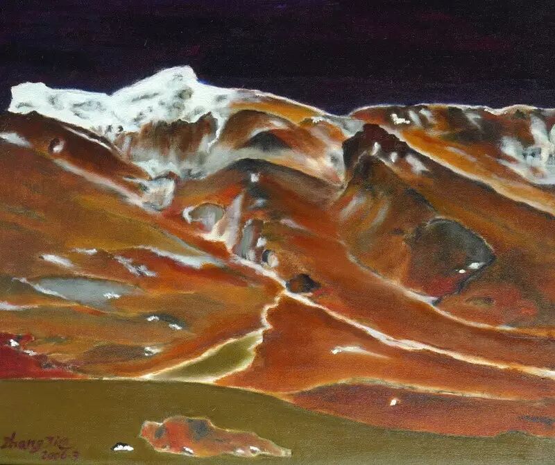 画面大约是一个暗红色的山体,黑色的岩石隐没其间,山的顶部覆盖着白色的积雪,水流顺势交织而下。这当然是我个人对这幅画的印象。画面的色彩对比强烈,富有表现主义的风格,我们可以把它想象成是一个火山遗迹,内里却依然岩浆奔涌,畜势待发。也可以想象成是火星的表面,经过漫长的时间的积淀和进化,凝聚着人类无数的想象与渴望。