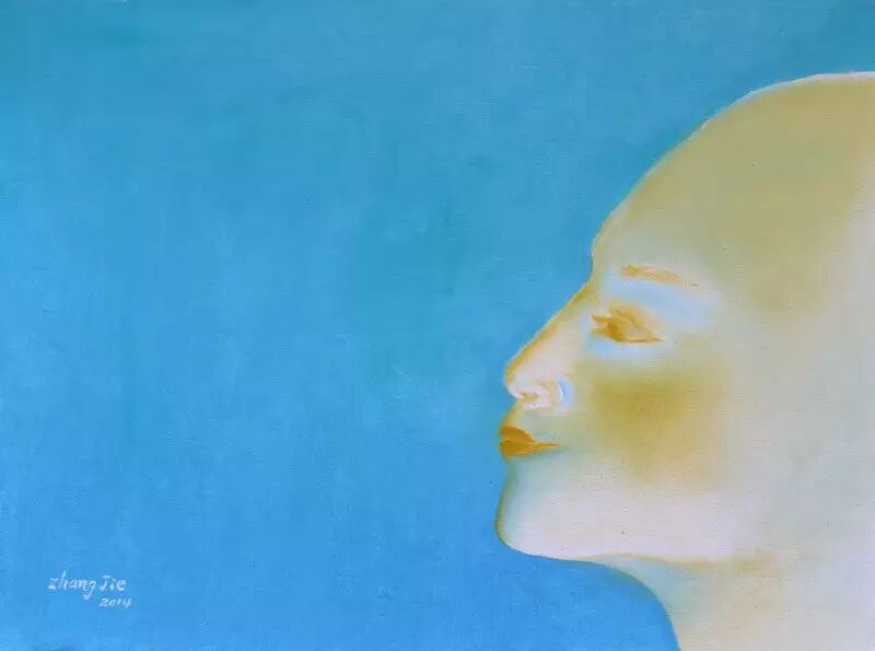 她还画了很多女性的形象,那幅“2014年”的侧面头像是她最珍视的一幅作品,海蓝色的背景衬托一个光头的女人,高高的额头,扬起的下颚,给我们一种傲视沧海,跨越世俗的姿态。这一定是张洁的自喻,或者是她渴望的一种境界。