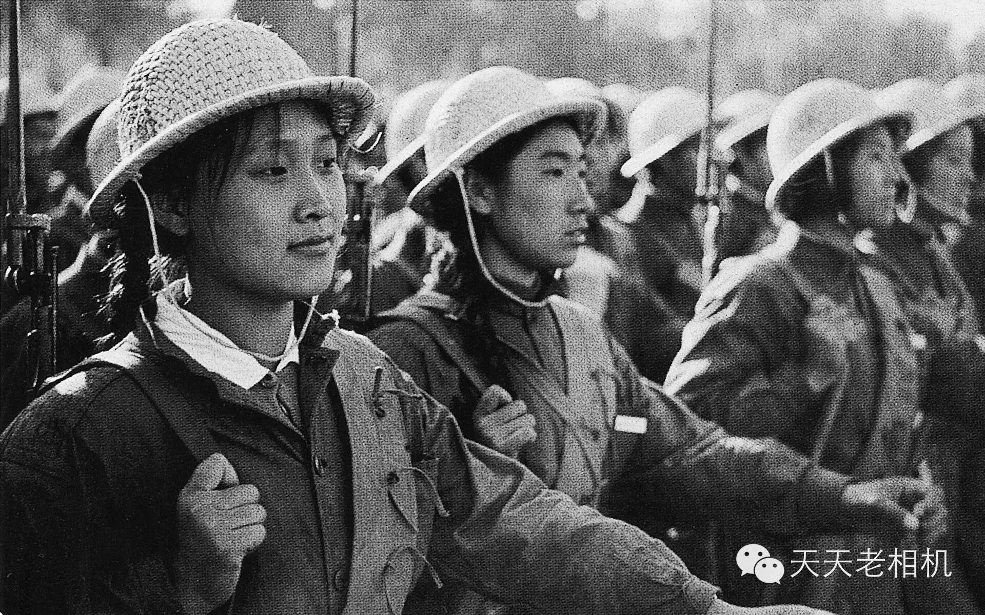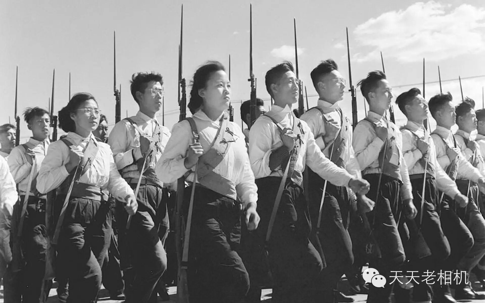 1958年10月1日,国庆阅兵式。由工人、农民、学生组成的众多民兵方队出现在受阅队伍中。女民兵方队首次在国庆大阅兵中出现