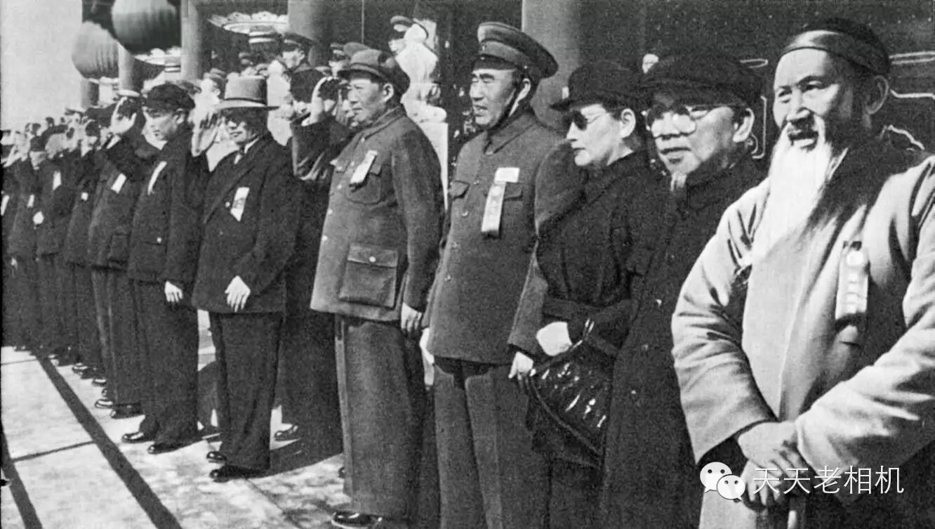 1953年10月1日,左至右:沈钧儒,邓小平,郭沫若,陈震,林伯渠,周恩来,张澜,宋庆龄,刘少奇,毛泽东,朱德,李济琛董必武,黄炎培,彭真。