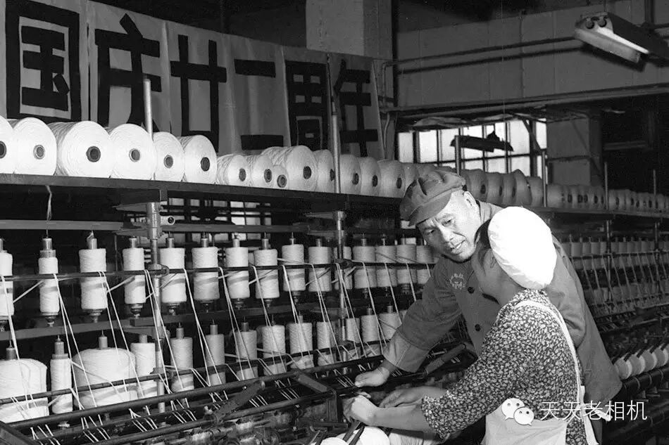 1971年10月2日,天津第二毛纺厂老工人李长茂和粗纱车间的工人,在国庆节期间坚守在生产岗位上。