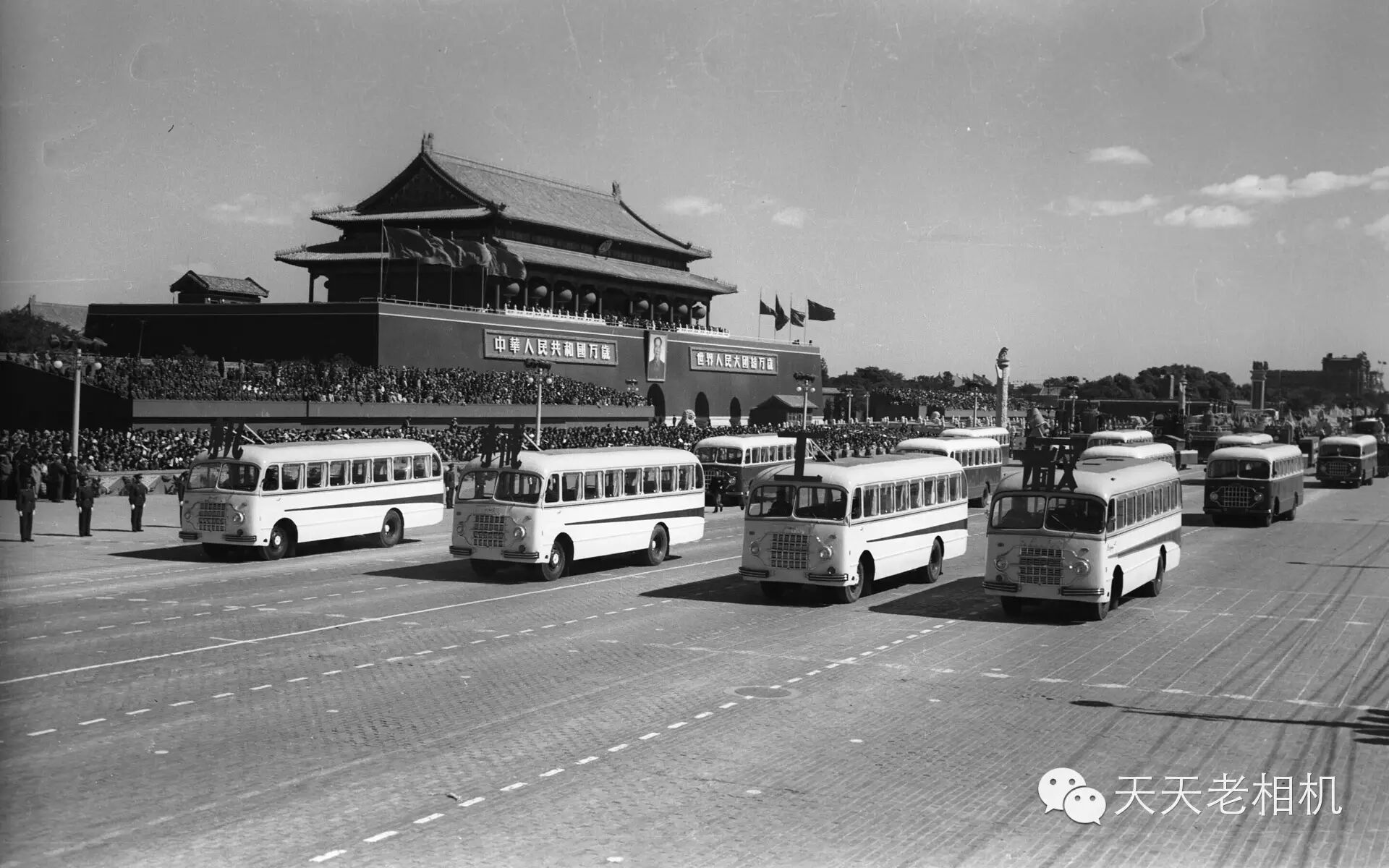 1954年10月1日,第6次国庆阅兵。天安门游行队伍——摩托化部队通过天安门。这次阅兵是中国人民解放军骑兵部队最后一次接受检阅。整个阅兵,历时63分钟