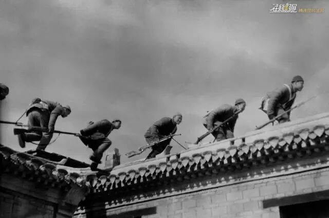 图为1944年,河北冉庄,游击队员由地道转上房顶。摄影:石少华。