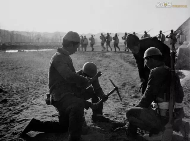 图为1943年,民兵在敌人的必经之路埋地雷。摄影:石少华。