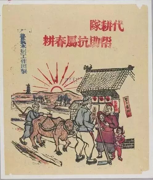 代耕队帮助抗属春耕 套色木刻版画,黄山定,1940年,35厘米×29.8厘米。