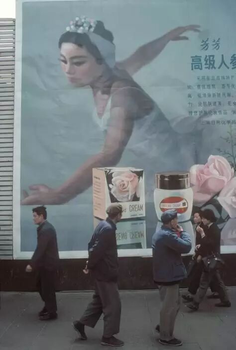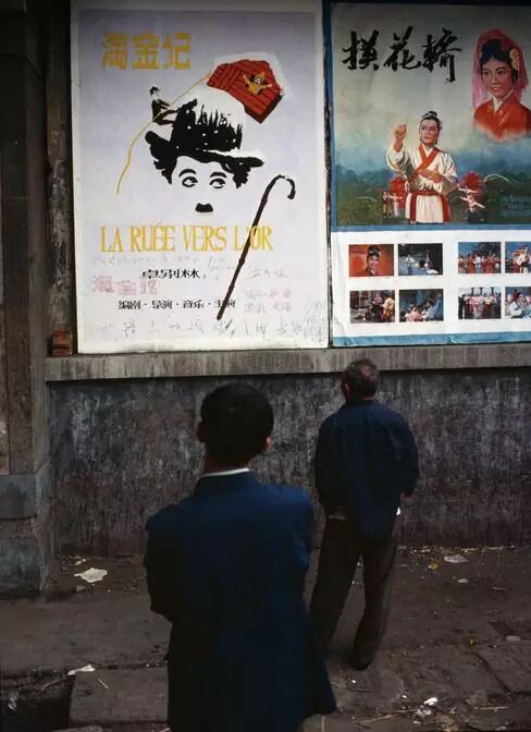 Chengdu. Cinema billboards including Charlie Chaplin. 1980