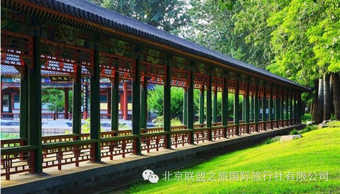 颐和园长廊在万寿山南麓和昆明湖北岸之间。始建于清代乾隆十五年(1750),1860年被英法联军焚毁后,于1888年又重新建造。长廊东起邀月门,西至石丈亭,中间穿过排云门,两侧对称点缀着留佳、寄澜、秋水、清遥四座重檐八角攒尖亭。象征春夏秋冬四季。全长728米,共273间,有548根柱子。长廊以其精美的建筑、曲折多变和极丰富的彩画而负盛名,是我国古建筑和园林中最长的廊。长廊还是一条五光十色的画廊,廊间的每根枋梁上都绘有彩画,共14000余幅,色彩鲜明,富丽堂皇,它的长度和丰富的彩画在1990年就被收入了《吉尼斯世界纪录大全》