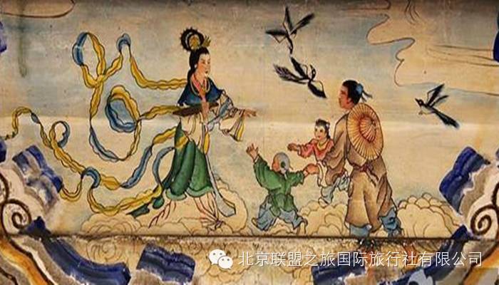 传说王母娘娘有七个美丽的仙女。小妹妹七仙女不甘天宫的寂寞,私自下凡来到人间。巧遇孝子董永。两人一见钟情,在老槐树下喜结良缘。婚后,七仙女为了使董永卖身地主的工期从三年减至百天,特邀众姐妹相助织锦。最终得以双双把家还。好景不长,天帝查出七仙女与凡人成亲,大发雷霆,特派天神传旨:七仙女午时三刻即返回天廷。已有身孕的七仙女肝胆欲碎,哭诉着与董永相约:“来年槐荫树下把子交。”说罢,飘然而去。董永悲痛欲绝,昏厥在地。