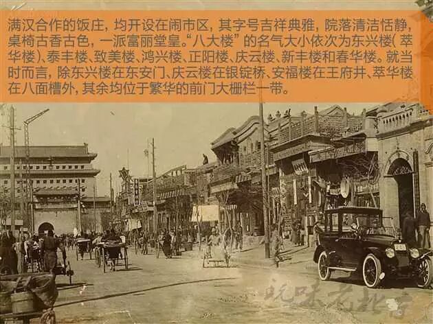 从清代一直到上世纪80年代,记录着京城变迁的前门都是北京当之无愧的商业中心之一——用现代的话说就是“CBD”,所以,饭庄才会在此扎堆。 不过,如今,前门已经难觅八大楼的踪迹,就像很多前文中说到的菜品都已经无法在菜单、餐桌上寻觅到一样。即使还能找到,也已经如同前门大街上那方方正正的 铛铛车一样,改装得像是电脑控制系统一样,再也不是司机大喊着“靠边儿站,靠边儿站”,铛铛……铛铛……的亲切感觉了。