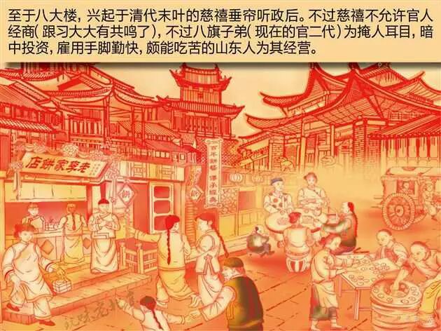 北京的饭庄兴起于慈禧太后垂帘听政之后,然而,按照“大清律”的明文规定,一向讲究“吃点、喝点、乐点”的满洲贵胄不许经商。为掩人耳目,八旗子弟暗中投资,雇用勤快、能吃苦的山东人为其经营。