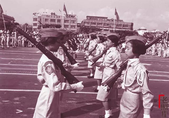 1955年,台北女学生在“双十节”的操枪表演。(原载《老照片》第43辑)53.“社会主义到了” 1956年1月20日,上海举行公私合营大会,工商界报喜队一位扮作“天官赐福”的报喜者来到了会场。(原载《老照片》第14辑)