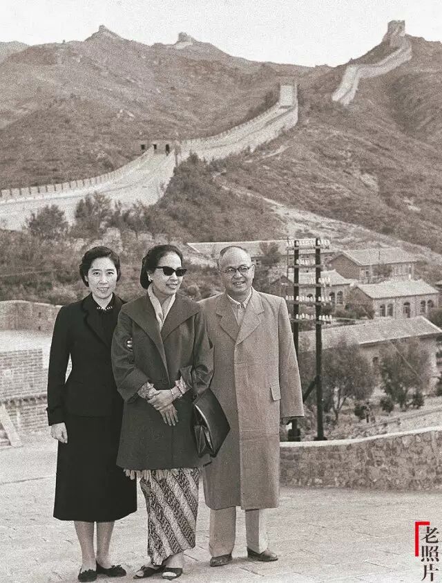 吴晗和王光美陪同印尼总统苏加诺夫人哈蒂尼游览长城。摄于1962年9月。(原载《老照片》第78辑)