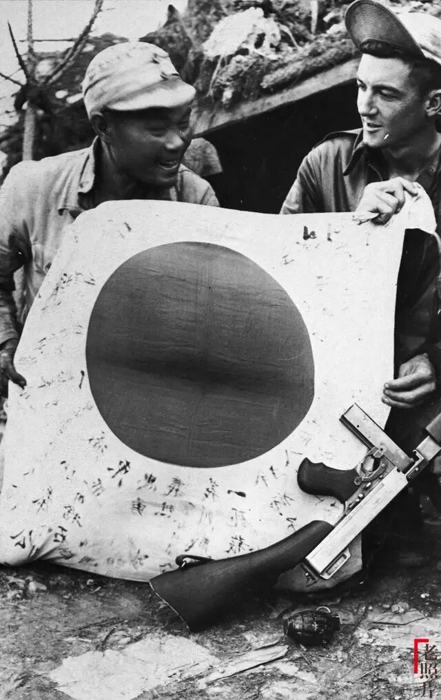1944年9月8日,中美士兵联合展示在战斗中缴获的日军太阳旗。前为在战斗中发挥显著作用的美式“汤姆逊”冲锋枪和美式手雷。(原载《老照片》第68辑)
