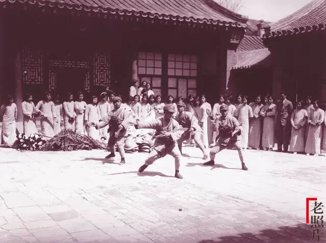 二十九军大刀队为广东省女师慰劳队表演中国传统刀术。(原载《老照片》第19辑)