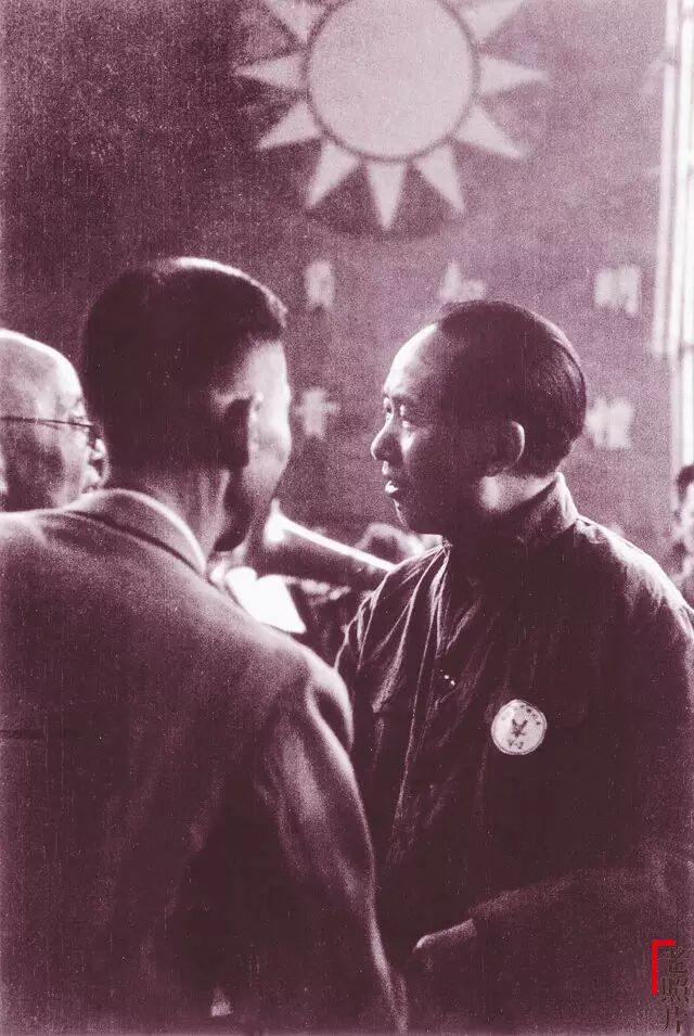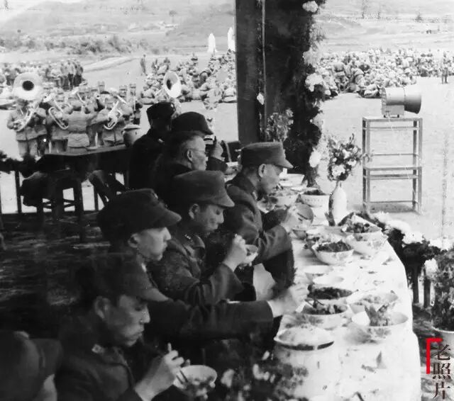 1946年4月,蒋介石于青年远征军第六军阅兵典礼后,与杨森等人在典礼台共进午餐。(原载《老照片》第71辑)