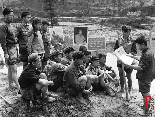 1969年,知青和贫下中农利用劳动间隙的休息时间,一起在田间学习中共“九大”文件。(原载《老照片》第100辑)