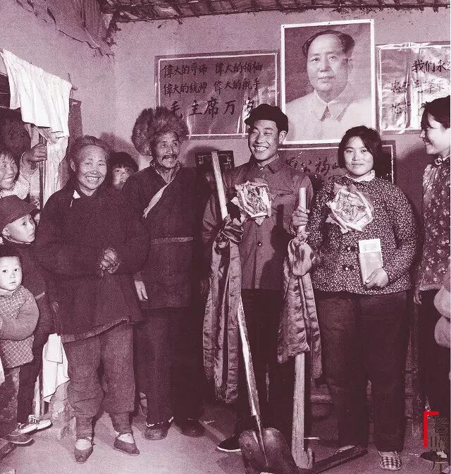 1966年11月21日,山东沂蒙山区的两位农村青年胸佩红花、手持农具和毛主席著作,举行了一场“革命化”婚礼。(原载《老照片》第37辑)